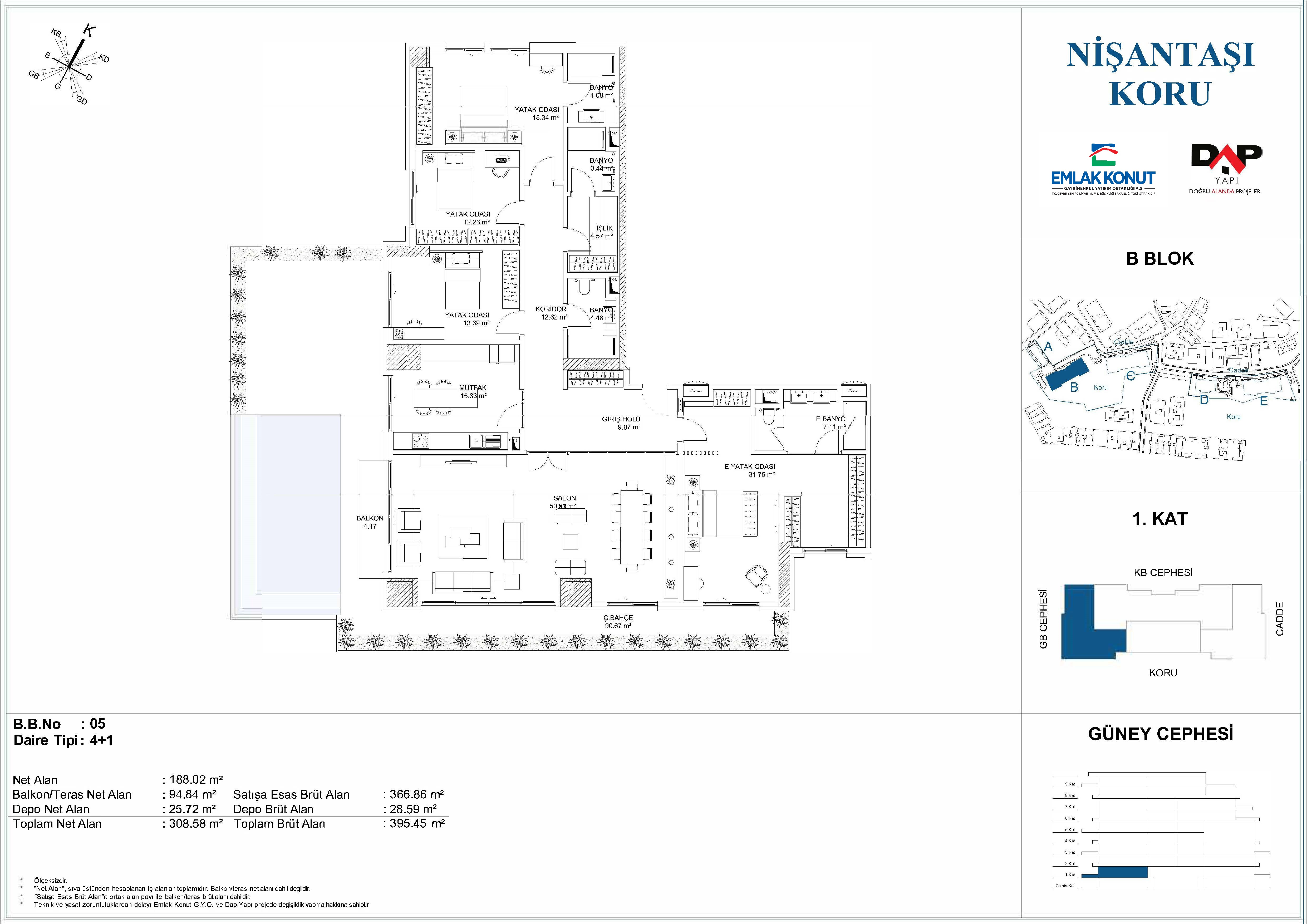 | B BLOK/5 | 366,86 m² | 188,02 m² | 4+1 | 1.KAT | GD-GB-KB | 20 |