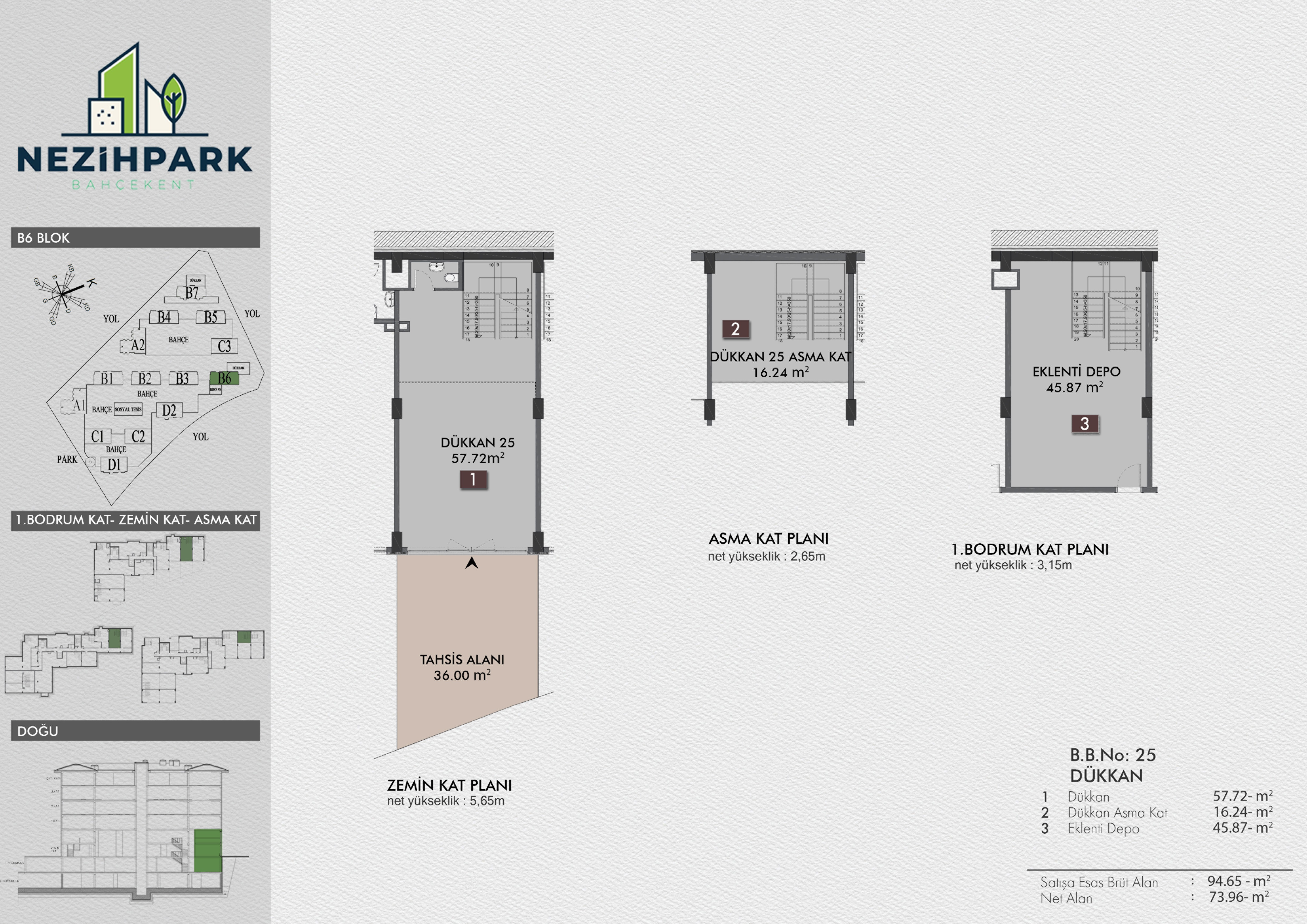 | B6/25 | 94,65 m² | 73,96 m² | 45,87 m² | 36,00 m² | ZEMİN KAT | D | 20 |