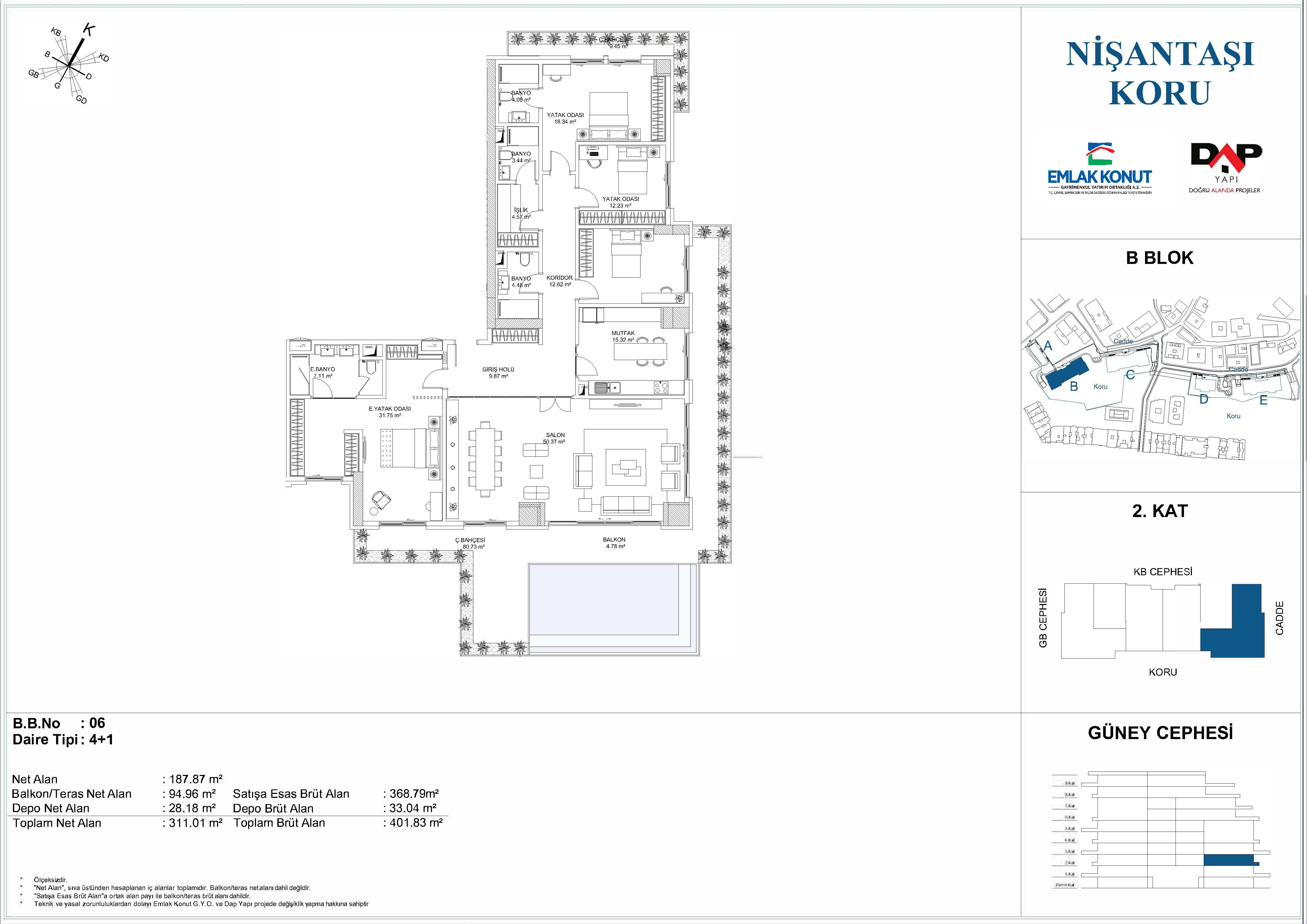 | B BLOK/6 | 368,79 m² | 187,87 m² | 4+1 | 2.KAT | KB-KD-GD | 20 |