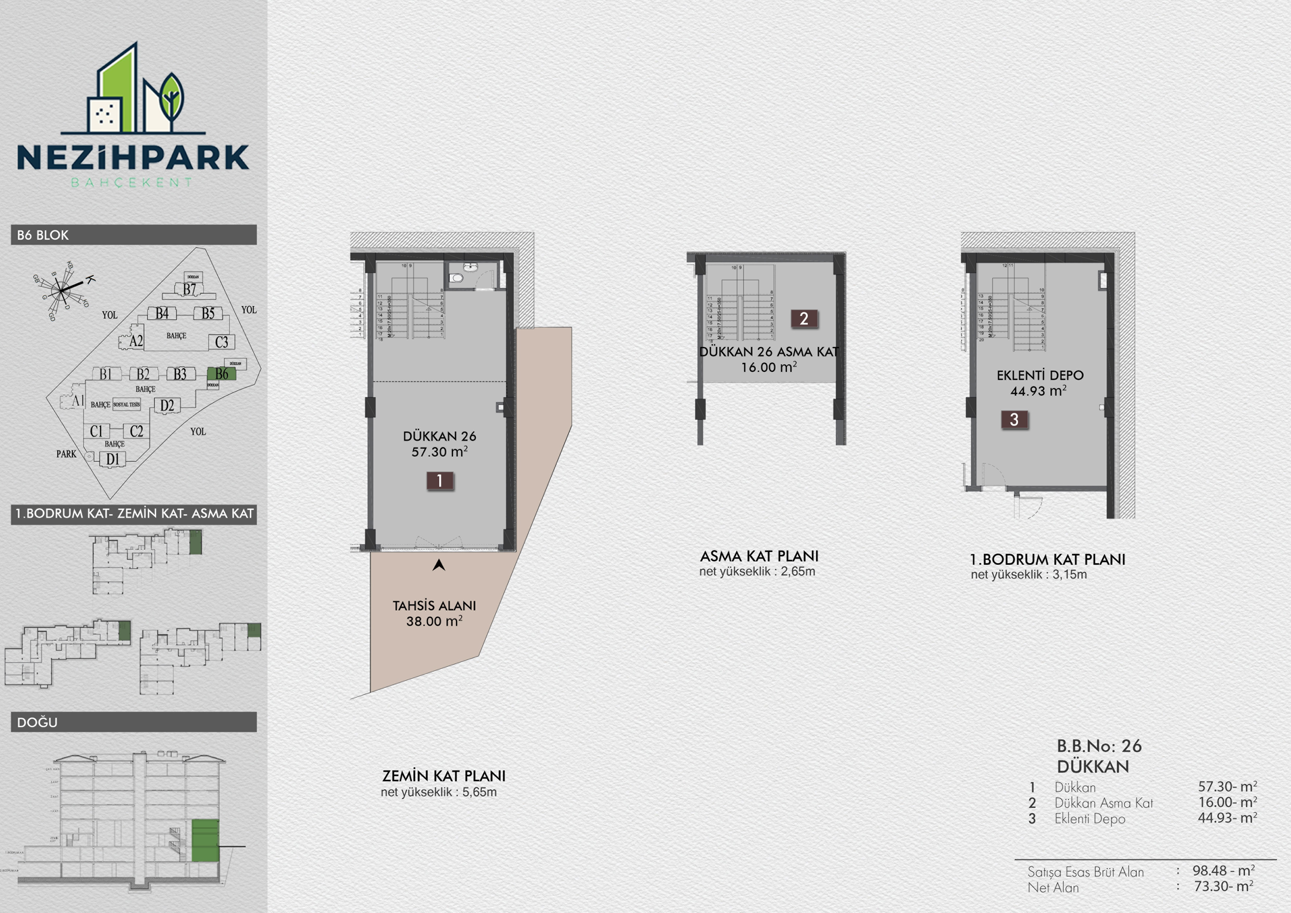 | B6/26 | 98,48 m² | 73,30 m² | 44,93 m² | 38,00 m² | ZEMİN KAT | D | 20 |