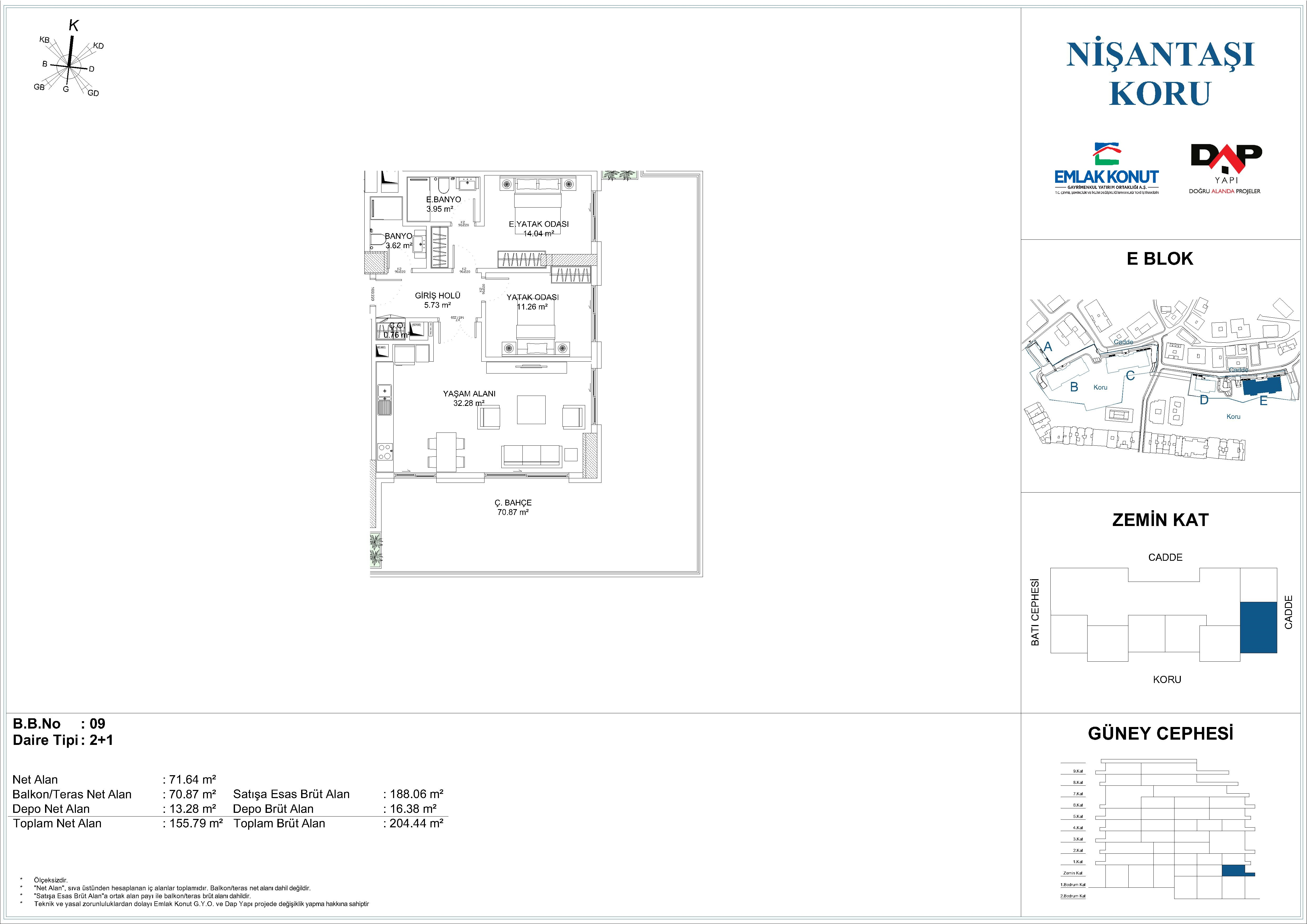 | E BLOK/9 | 188,06 m² | 71,64 m² | 2+1 | ZEMİN KAT | G-D | 1 |