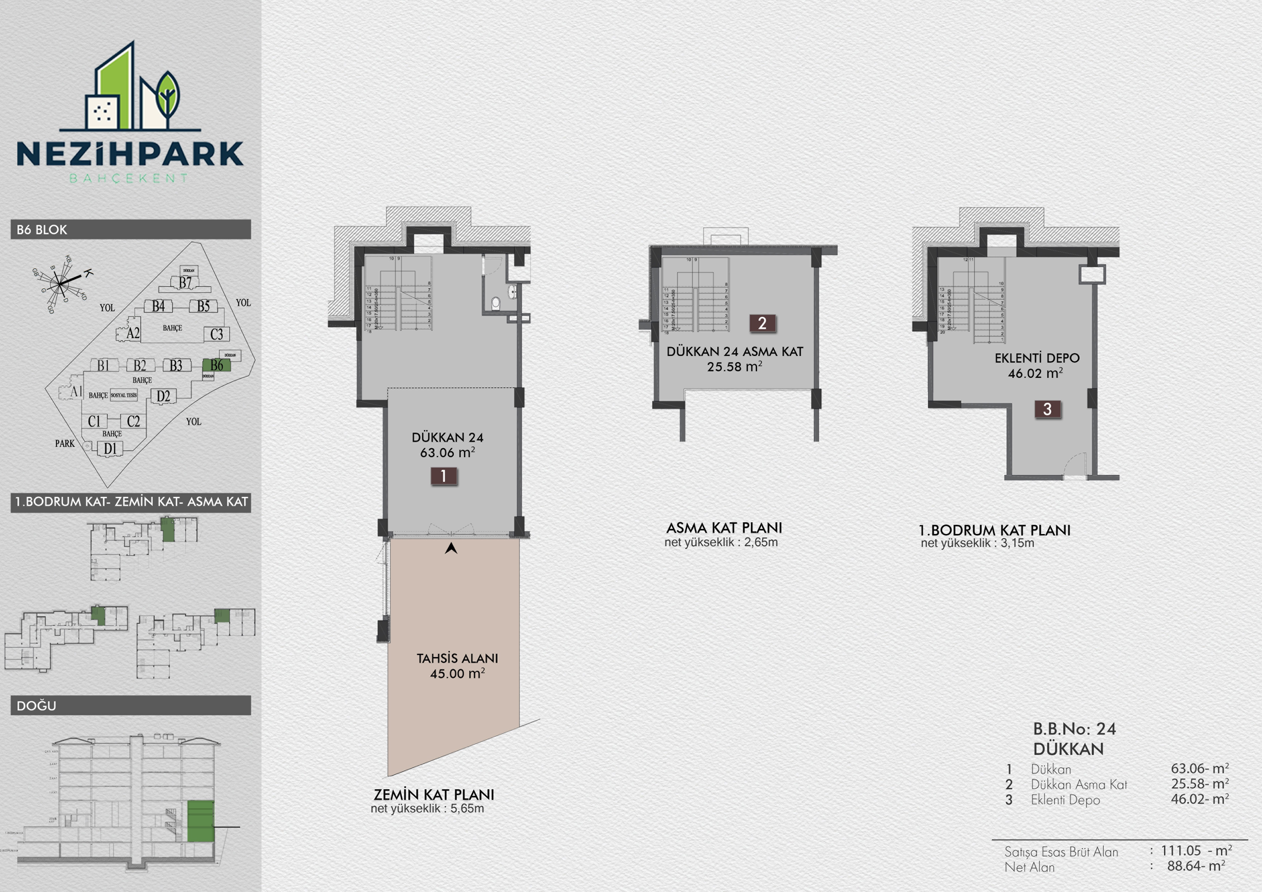 | B6/24 | 111,05 m² | 88,64 m² | 46,02 m² | 45,00 m² | ZEMİN KAT | D | 20 |